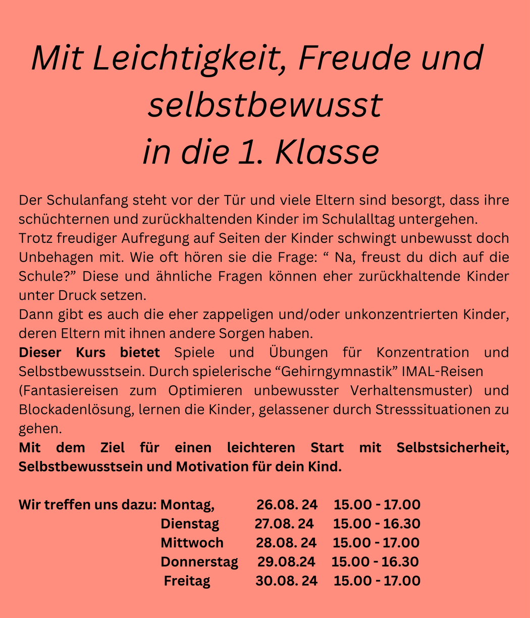 Selbstbewusst ist das neue COOL In diesem Programm kann jedes Kind in einem achtsamen und respektvollem Rahmen sein Potenzial wiederentdecken, seinen Selbstwert aufbauen, sich seiner eigenen Stärken bewusst werden und mehr… Die letzten Jahre haben Spuren bei unseren Kindern hinterlassen, zB. ist jedes 3. Kind von Mobbing und Ausgrenzung betroffen, was oft zu Isolation, Verunsicherung, Ängsten und vermindertem Selbstwert führt. Es ist jedes Kind mit all seiner Individualität, seinen Themen willkommen. Jeder Einzelne gibt seine „Zutaten“ hinein, es entwickelt sich ein Gemeinschaftsgefühl, Kinder erleben sich als selbstwirksam. Ist Ihr Kind und sind Sie als Eltern mutig für diese „Reise“? Dann freue ich mich, euch / Sie kennenzulernen...